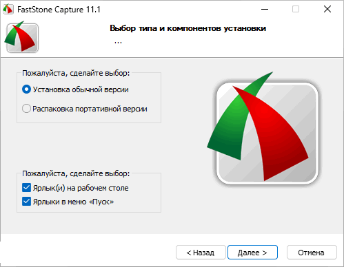 • Также возможен выбор каталога для установки: После всех ключей необходимо добавить /D=%путь% Пример: файл_установки.exe /S /IR /D=C:\ FastStone
